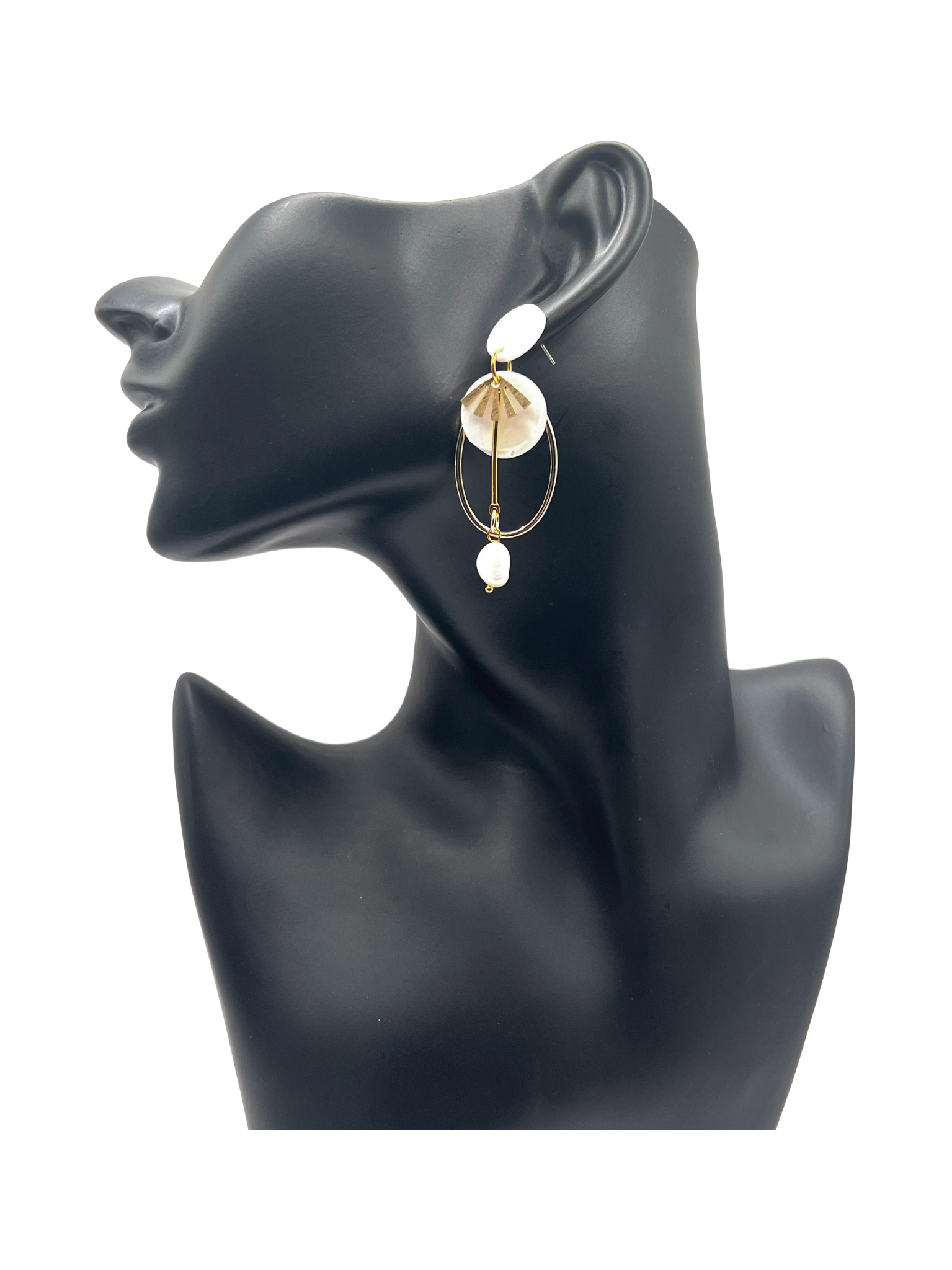 Elegantiški auskarai su baltu akcentu, auksiniais elementais ir perlų detale.